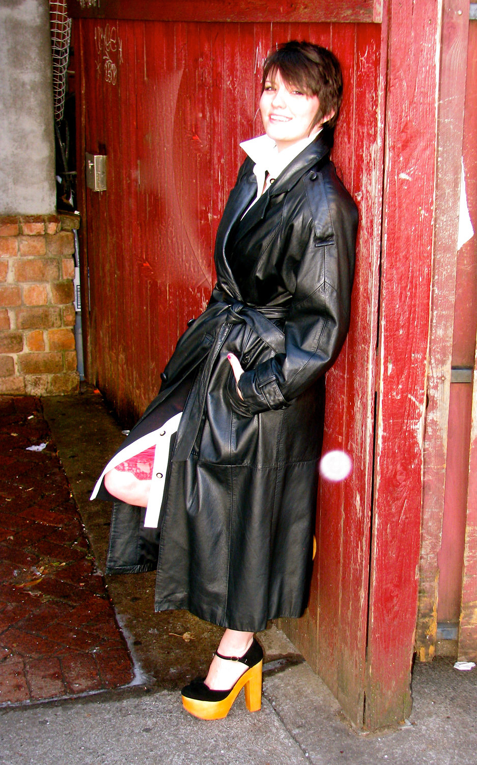 At a glance, she was a svelte feminine figure sculpted entirely of shiny black leather. Even the pristine white collar of her blouse melded within the bright highlights reflected from her lustrous leather coat.