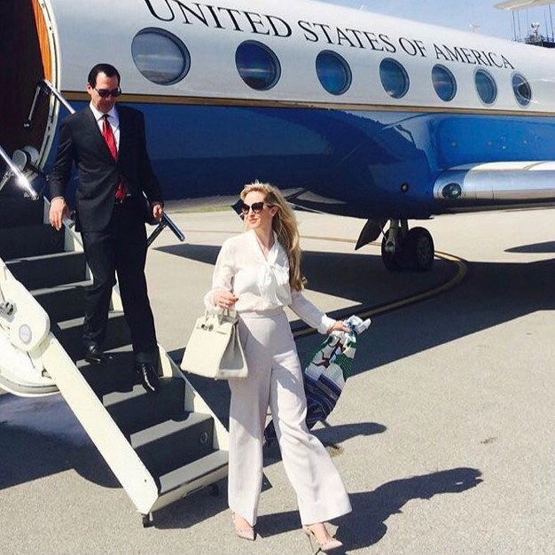 So I just discovered this fascinating woman the other day. Her name is Louise Linton and she is married to the US Treasury Chief. During a visit to the Bureau of Engraving and Printing in November 2017 she was encouraged by her husband to pose with him in photographs holding newly printed money- thus revealing the amazing outfit she was wearing in the photos below. Wow!